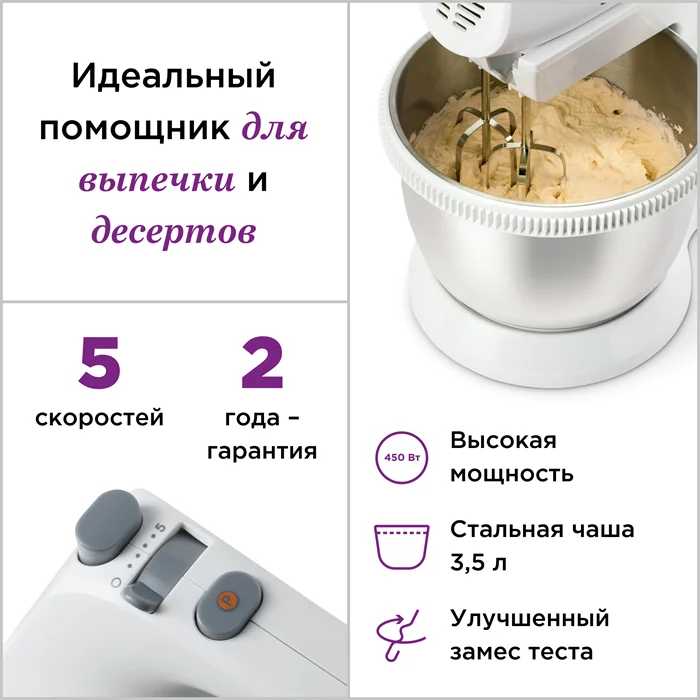 - КомплектацияМиксер, подставка, чаша из нержавеющей стали, два венчика для взбивания, два крюка для замеса теста, инструкция, гаранийный талон.