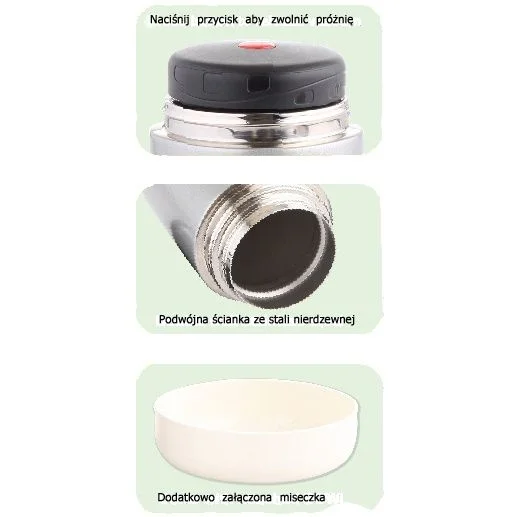 Термос изготовлен из высококачественной нержавеющей стали. Конструкция из двойной стенки. Легкий, удобный для переноски, устойчив. Предназначен для продуктов питания и напитков, идеально подходит для школы, офиса и пикника на свежем воздухе. Сохраняет тепло в течение длительного времени.