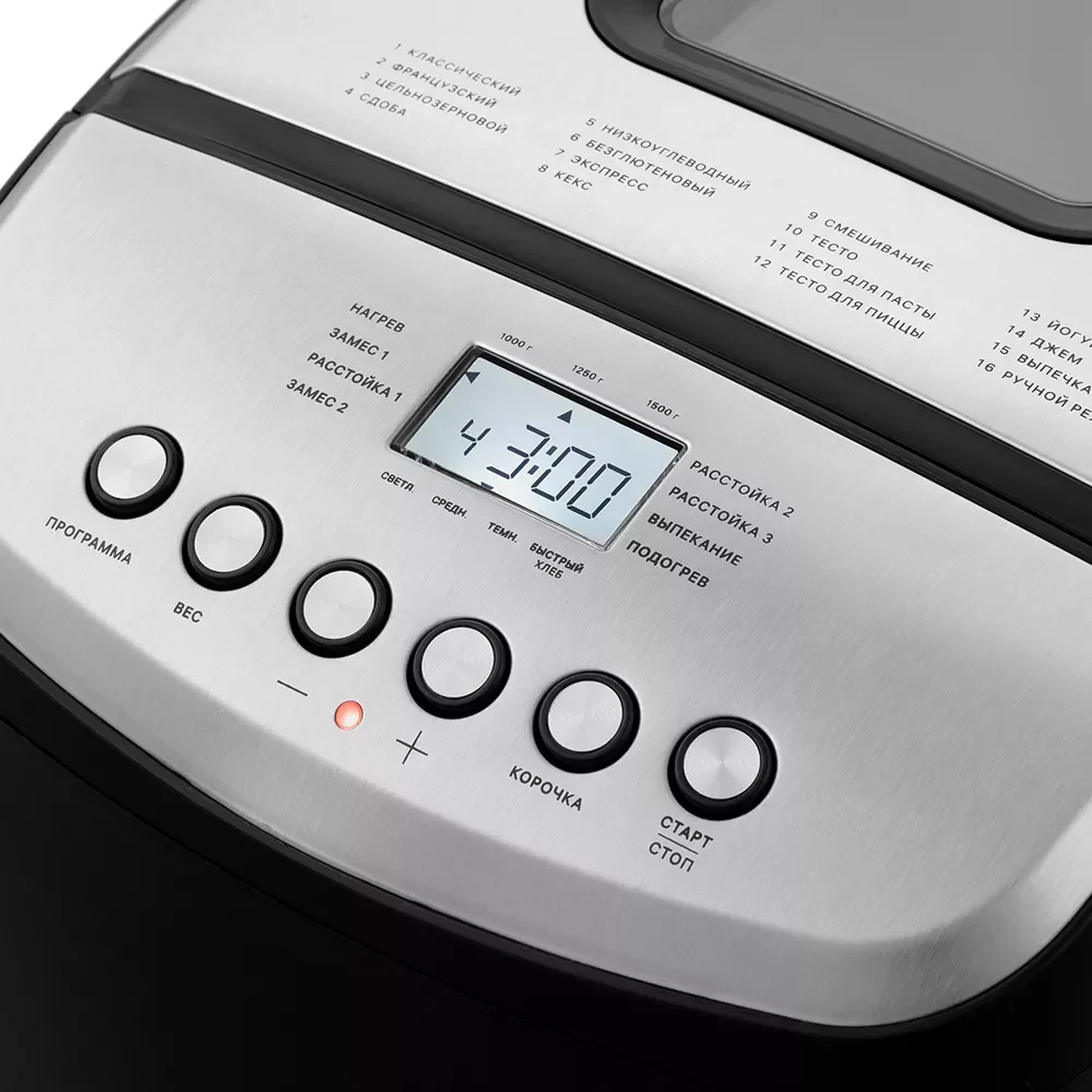 С помощью 16 автоматических программ вы легко приготовите выпечку, ржаной хлеб, сдобу, десерты, замесите тесто на пироги или пиццу! Имеется функция отложенного старта. В случае отключения электропитания прибор сохранит настройки в течение 10 мин.
