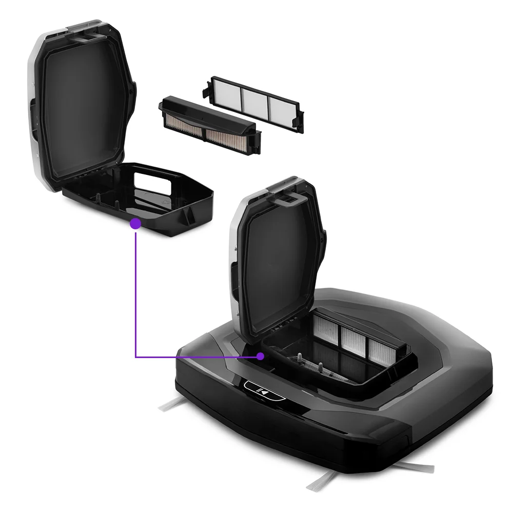 В пылесборнике робота-пылесоса используется двойная фильтрация и высокоэффективный фильтр тонкой очистки, обеспечивающий хорошую очистку засасываемого воздуха от пыли. Сам пылесборник легко вынимается и чистится после уборки.
