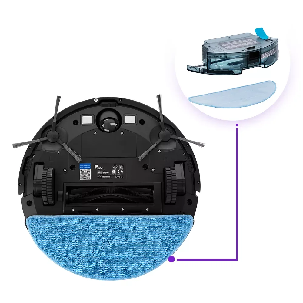 Вы можете провести влажную уборку, прикрепив к пылесосу моющий модуль с резервуаром для воды и тряпкой, которая автоматически увлажняется во время работы. Робот сначала засасывает пыль и мусор в пылесборник, а затем увлажняет пол тряпкой.