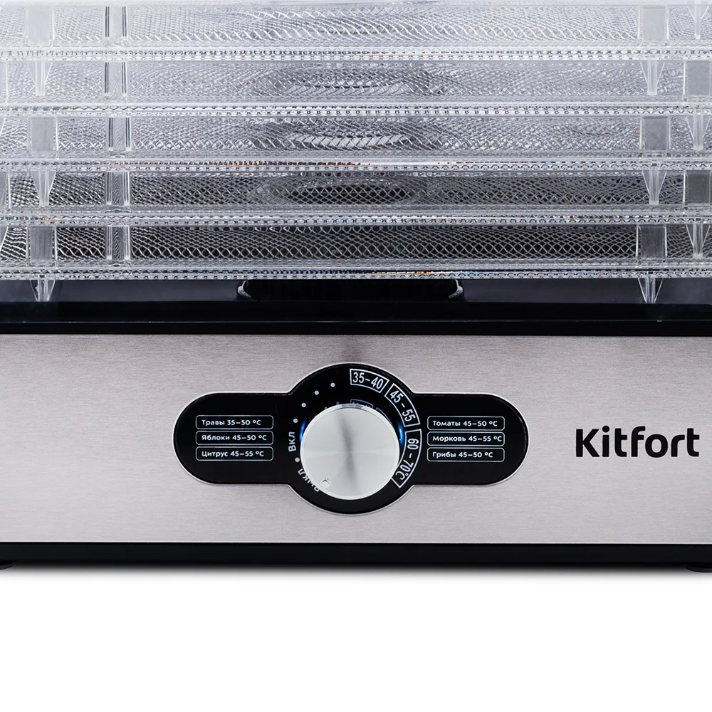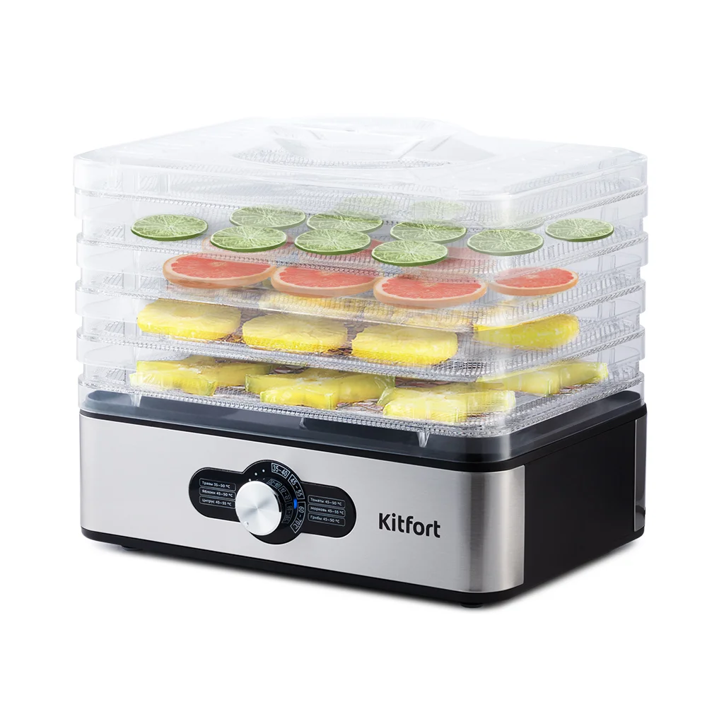 Сушилка имеет в комплекте 5 вместительных поддонов с сеткой из нержавеющей стали и прозрачными стенками, поэтому вы легко сможете наблюдать за процессом сушки.