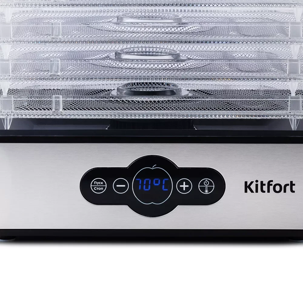 Сушилка имеет в комплекте 5 вместительных поддонов с сеткой из нержавеющей стали и прозрачными стенками, поэтому вы легко сможете наблюдать за процессом сушки.