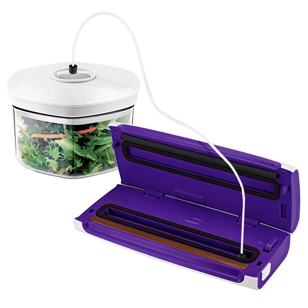 В комплектации с вакууматором идут 5 пакетов для вакуумирования размерами 22х30 см, шланг для откачки воздуха в контейнеры и резак, который поможет вам отрезать нужной длины пакет и удалить шов после запечатывания пакета.