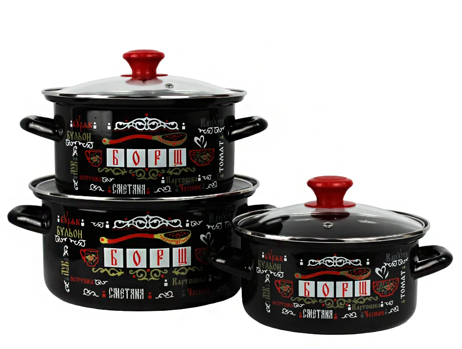 Набор «Борщ-1-Экстра» (коричневый) — это набор эмалированных кастрюль. В его состав входят: кастрюля объёмом 2,3 л с крышкой (1 шт.), кастрюля объёмом 3 л с крышкой (1 шт.) и кастрюля объёмом 4 л с крышкой (1 шт.).