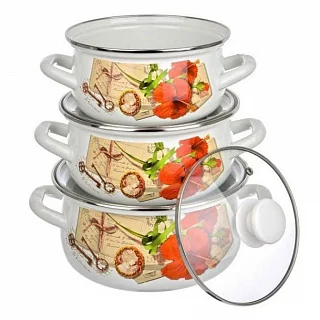 - Набор эмалированных кастрюль сферических со стеклянными крышками