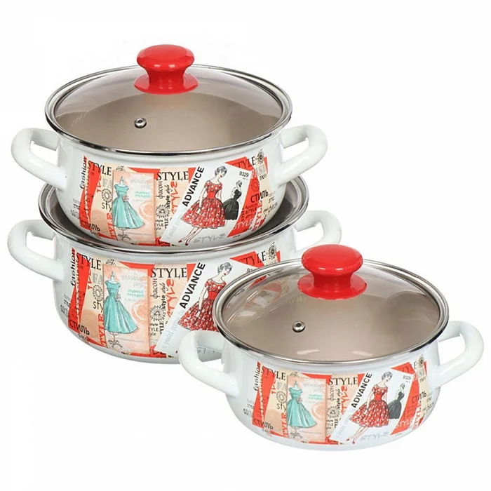 - Набор эмалированных кастрюль сферических со стеклянными крышками
