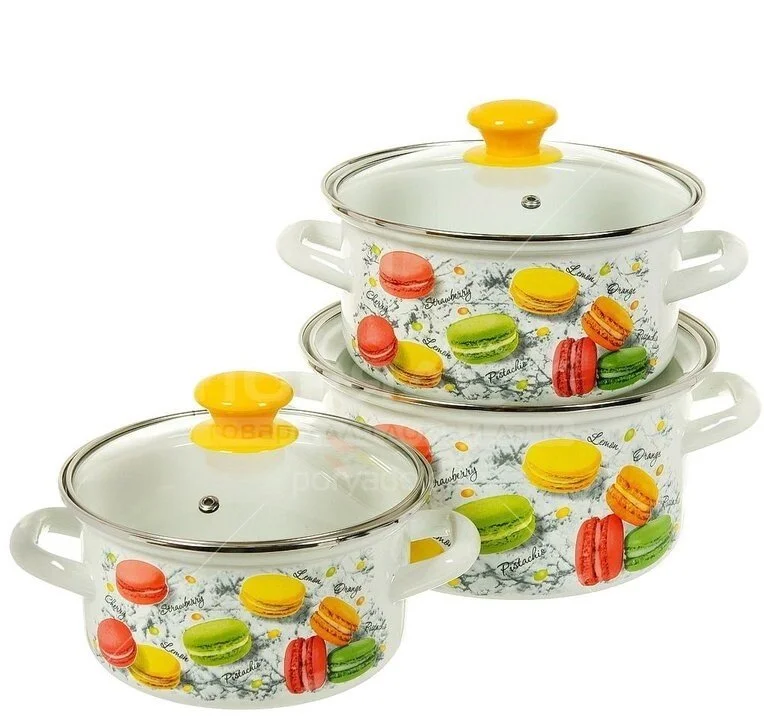 Набор кастрюль "Цветное печенье-1" цилиндрической формы выполнены из стали и имеет высококачественное эмалевое покрытие. Все изделия в наборе оформлены оригинальным рисунком. В комплекте с кастрюлями есть крышки с ручками из термостойкого пластика. Кастрюли могут быть использованы на всех типах кухонных плит: электрических, газовых, керамических и индукционных. Подходит для мытья в посудомоечных машинах.
