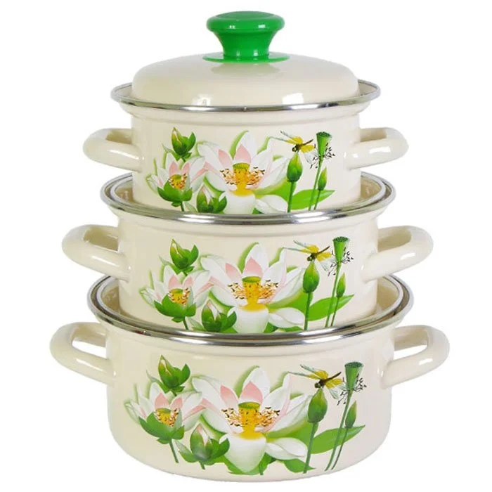 Набор кастрюль "Лотос" цилиндрической формы выполнены из стали и имеет высококачественное эмалевое покрытие. Все изделия в наборе оформлены оригинальным рисунком. В комплекте с кастрюлями есть крышки с ручками из термостойкого пластика. Кастрюли могут быть использованы на всех типах кухонных плит: электрических, газовых, керамических и индукционных. Подходит для мытья в посудомоечных машинах.