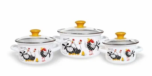 Набор «Птичий двор-1-Экстра» (белый) — это набор кастрюль из эмалированной стали цилиндрической формы. В него входят ёмкости объёмом 1,0 л, 1,5 л и 2,3 л с ярким рисунком.