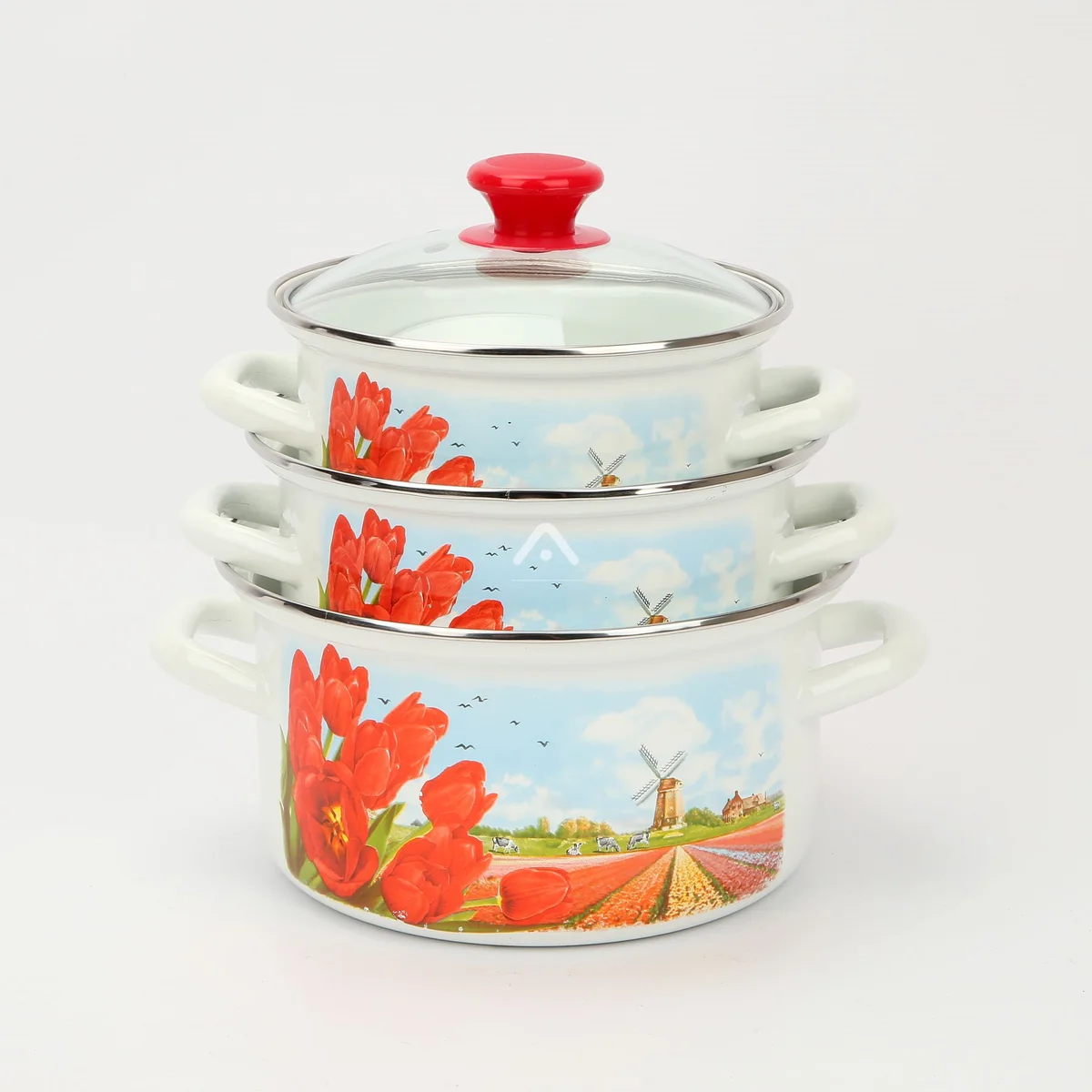 Набор кастрюль "Страна тюльпанов" цилиндрической формы выполнены из стали и имеет высококачественное эмалевое покрытие. Все изделия в наборе оформлены оригинальным рисунком. В комплекте с кастрюлями есть крышки с ручками из термостойкого пластика. Кастрюли могут быть использованы на всех типах кухонных плит: электрических, газовых, керамических и индукционных. Подходит для мытья в посудомоечных машинах.