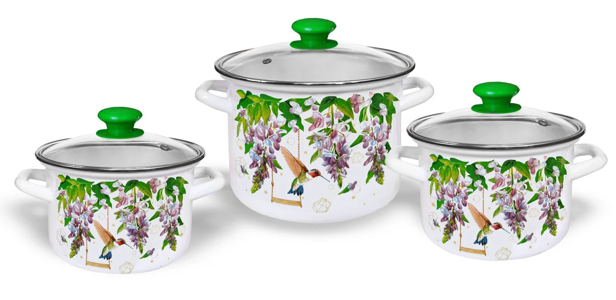 - Кастрюли цилиндрической формы с нержавеющим ободком.