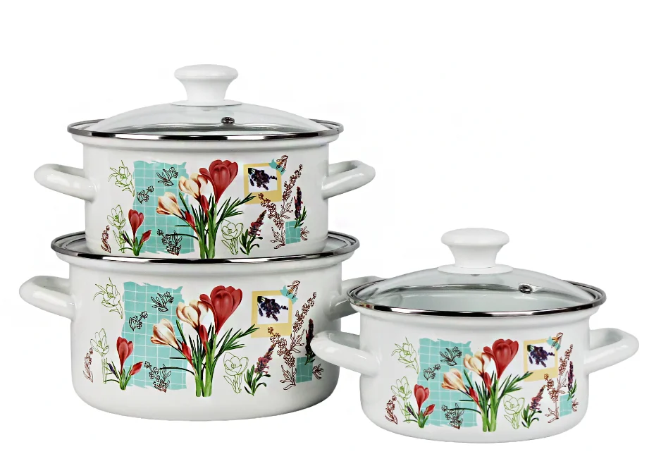 Набор кастрюль «Шафран-1-Экстра» (белая) включает в себя ёмкости объёмом 1,5, 2,3 и 3 литра. Материал — эмалированная сталь.