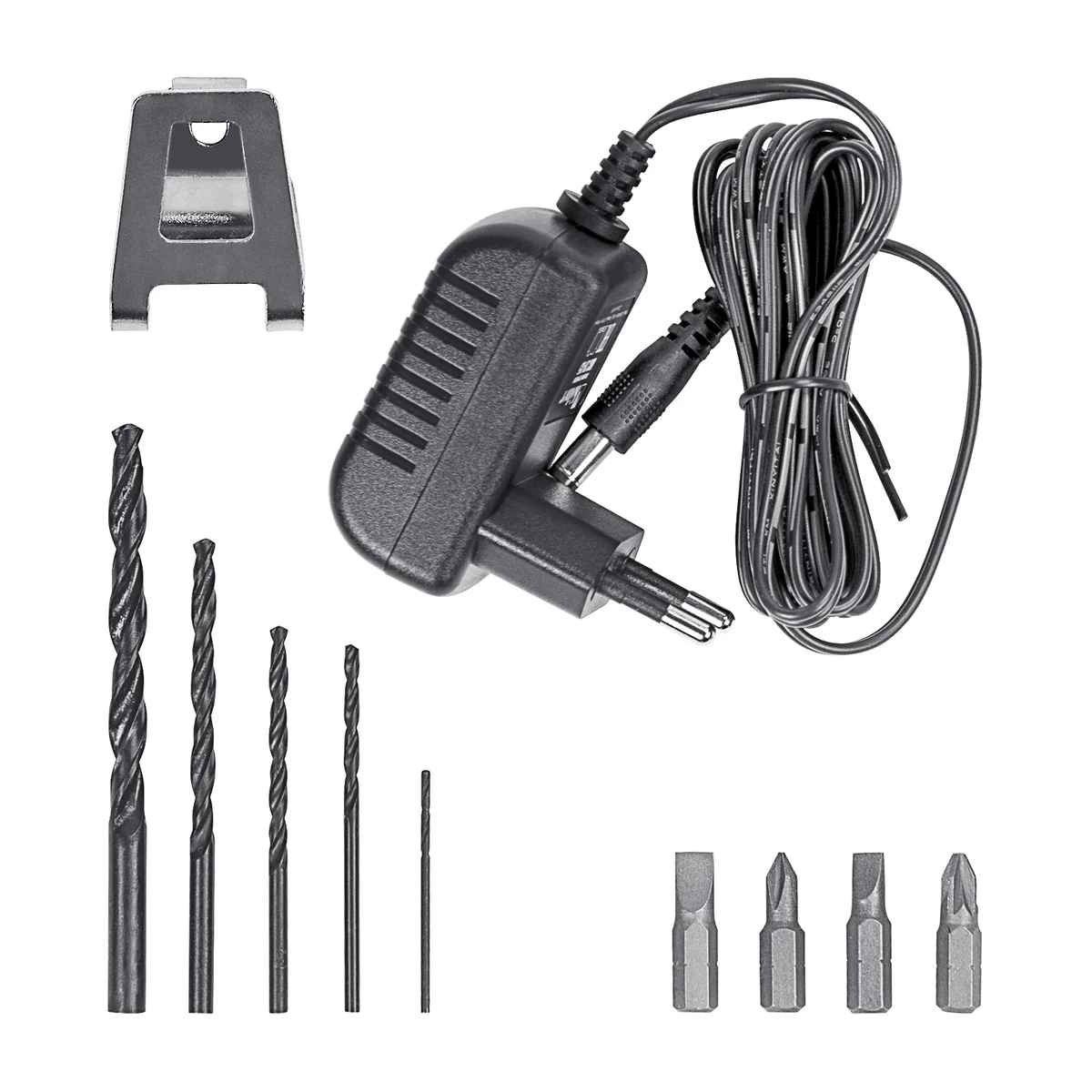 - РАСШИРЕННАЯ КОМПЛЕКТАЦИЯ - аккумулятор (2 шт.), зарядное устройство, сверло (6 шт.), бита (6 шт.), переходник для бит, клипса, пластиковый кейс.