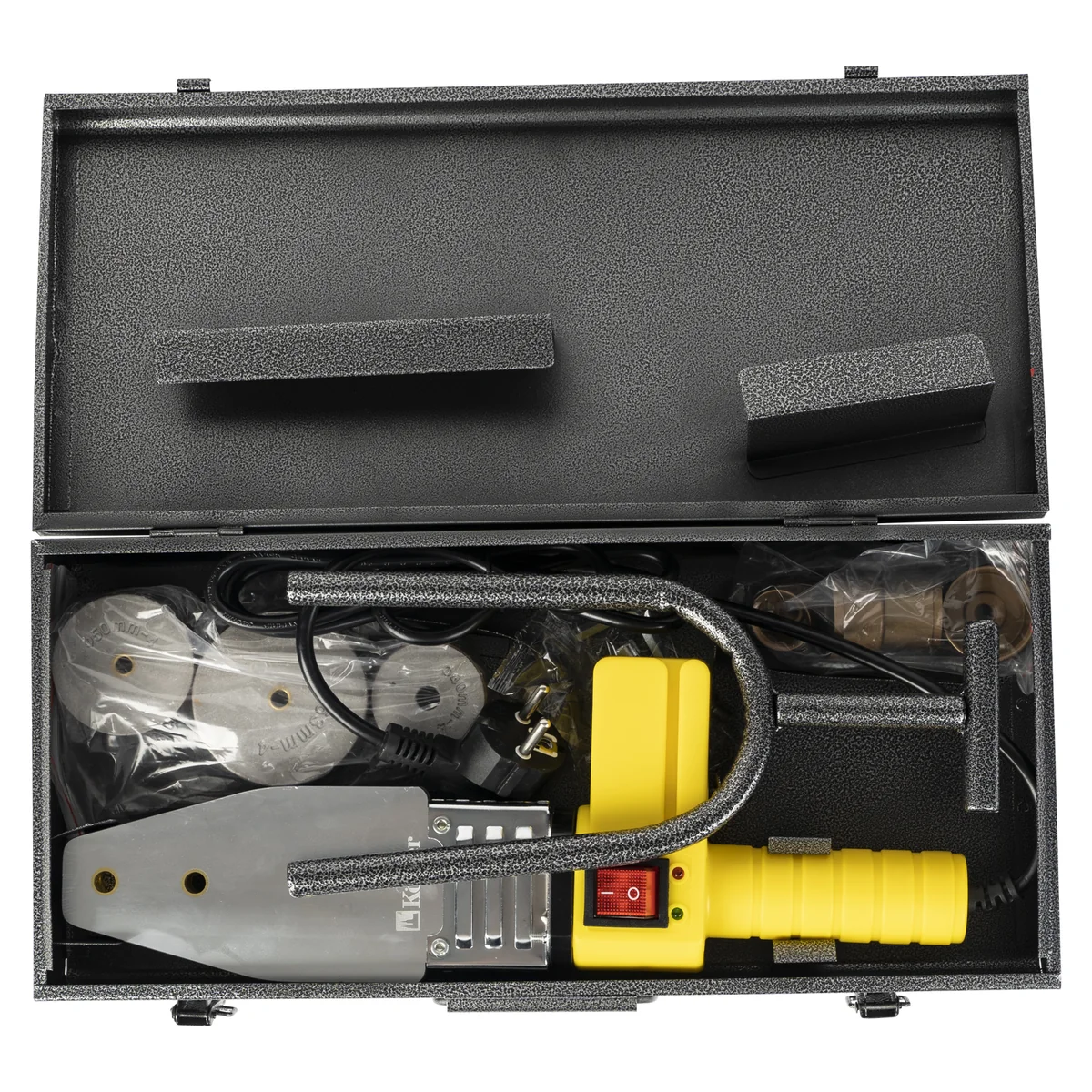 РАСШИРЕННАЯ КОМПЛЕКТАЦИЯ: насадка (нагревательная гильза и дорн) 6 шт. (20 мм, 25 мм, 32 мм, 40 мм, 50 мм, 63, мм), винт (2 шт.), шестигранный ключ, подставка, кейс.