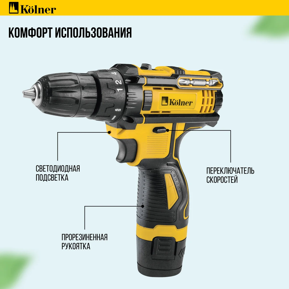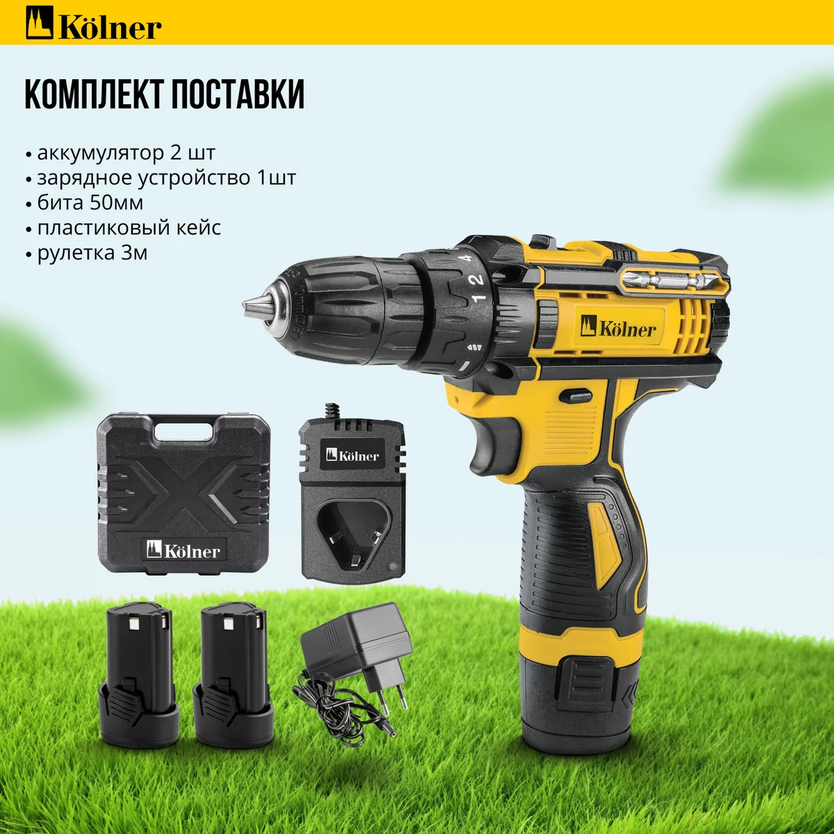 В комплекте два аккумулятора, зарядное устройство, пластиковый кейс и набор бит, что делает этот инструмент идеальным выбором для дома.
