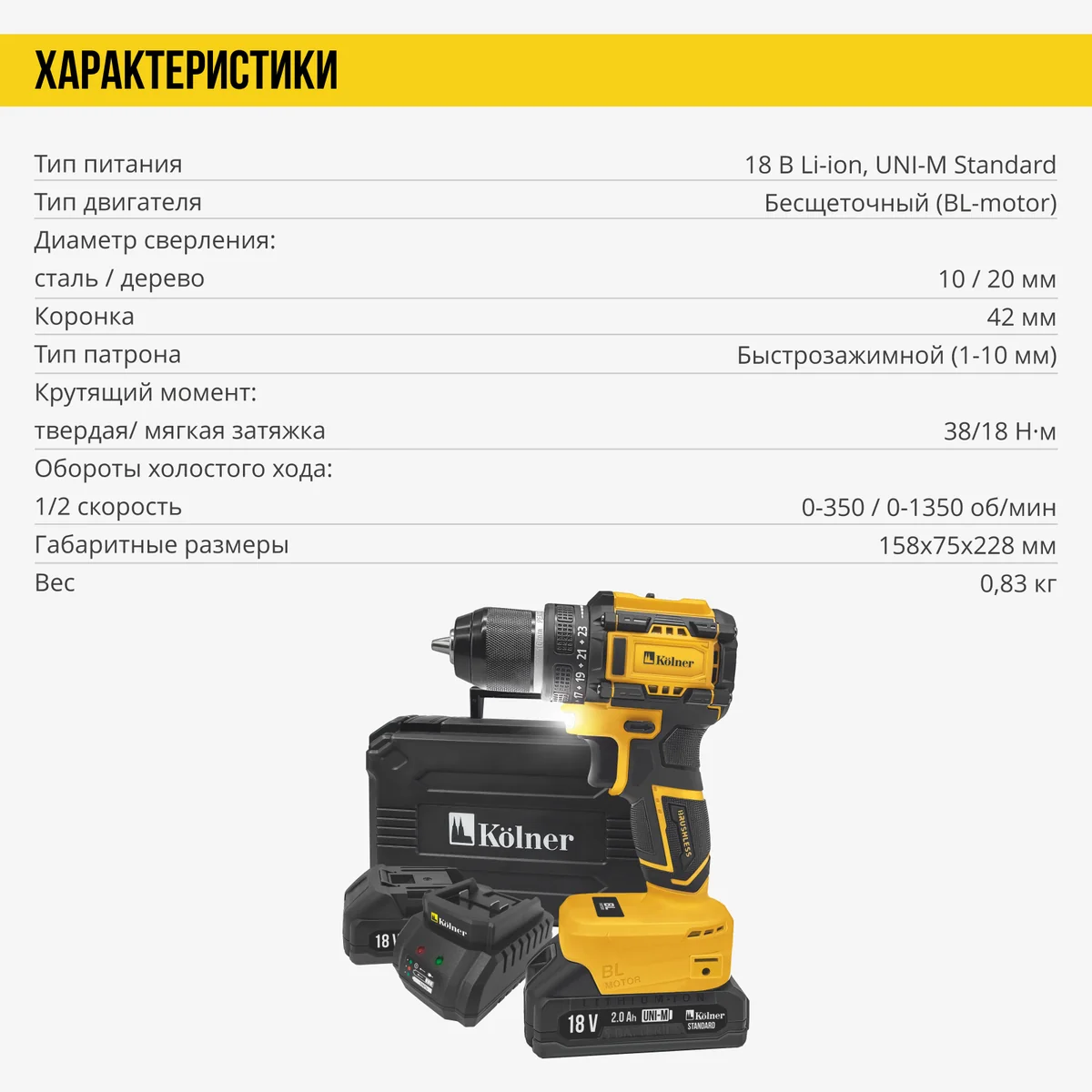 Дрель-шуруповёрт аккумуляторная KDD 18BL-2K 18V UNI-M Standard