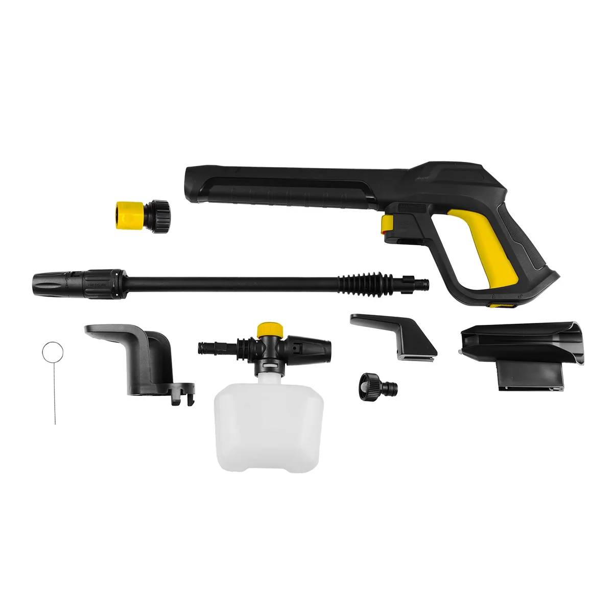 - В комплекте: пистолет высокого давления, распылитель, пеногенератор, переходник, быстросъем для шланга 3/4, гибкий шланг высокого давления, колеса, игла для очистки сопла
