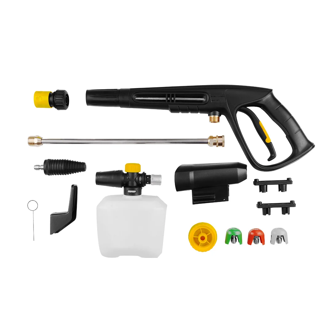 В КОМПЛЕКТЕ: пистолет высокого давления, распылитель, пеногенератор, форсунки 3 шт., насадка распылитель TURBO, переходник, быстросъем для шланга 3/4, гибкий шланг высокого давления, колеса, игла для очистки сопла