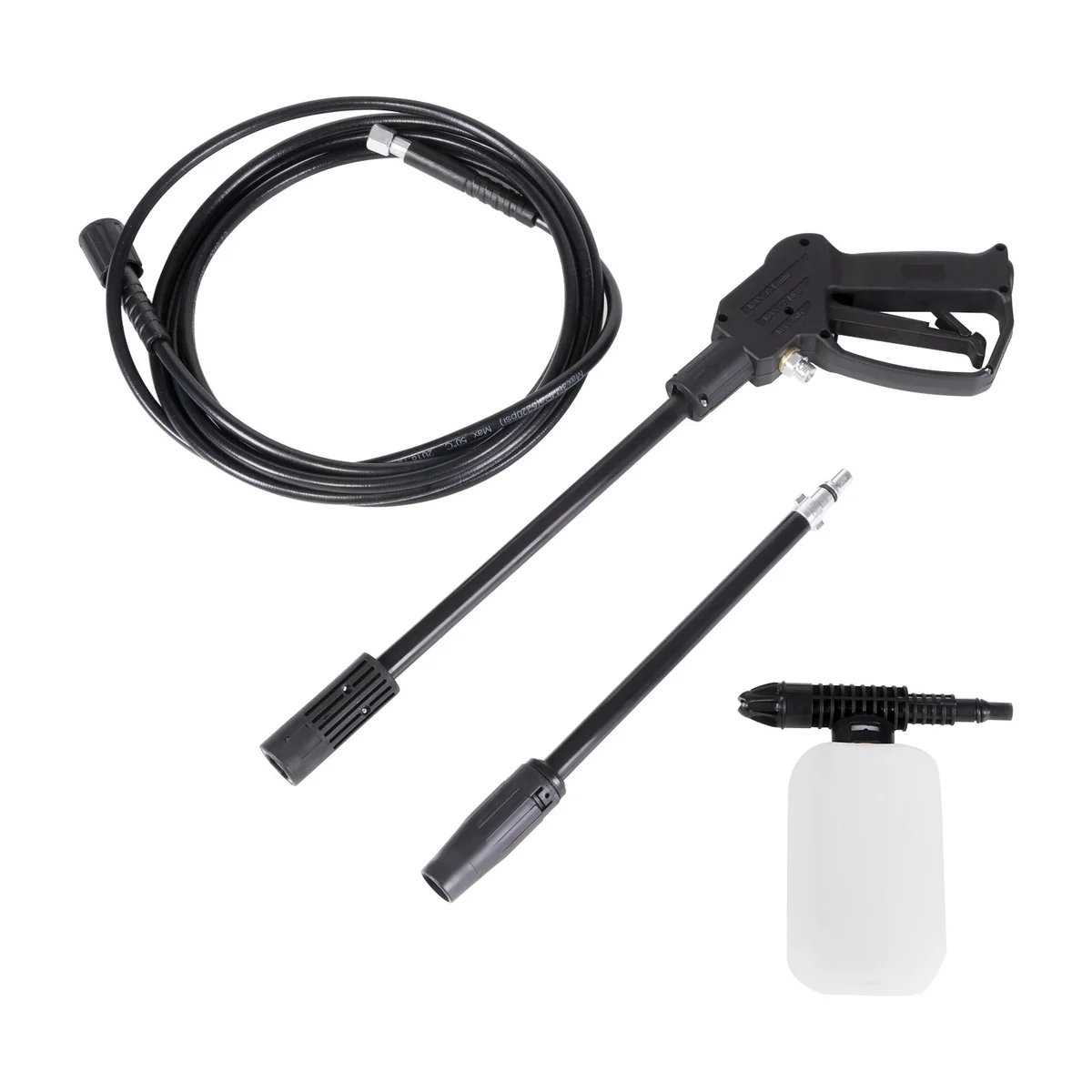 - КОМПЛЕКТАЦИЯ: пистолет-распылитель, удлинитель пистолета с соплом, гибкий шланг высокого давления, емкость для моющих средств, переходник, игла для очистки сопла.