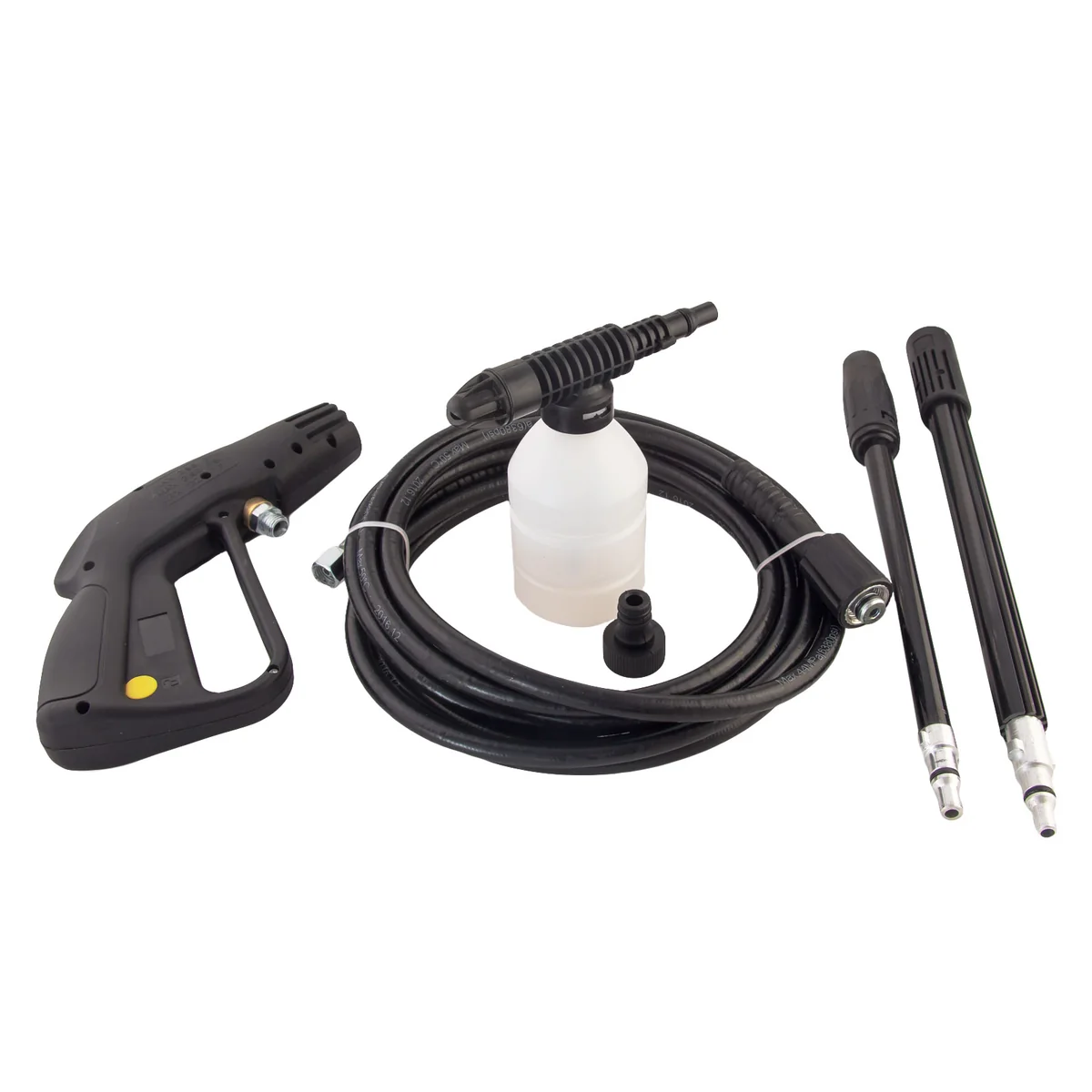 - КОМПЛЕКТАЦИЯ: пистолет-распылитель, удлинитель пистолета с соплом, гибкий шланг высокого давления, емкость для моющих средств, переходник, игла для очистки сопла.