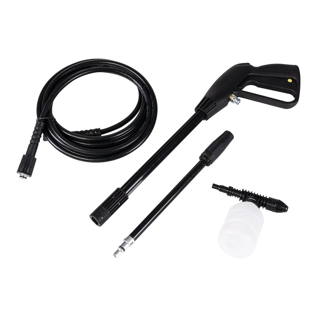 - КОМПЛЕКТАЦИЯ: пистолет-распылитель, удлинитель пистолета с соплом, гибкий шланг высокого давления, емкость для моющих средств, переходник, игла для очистки сопла.