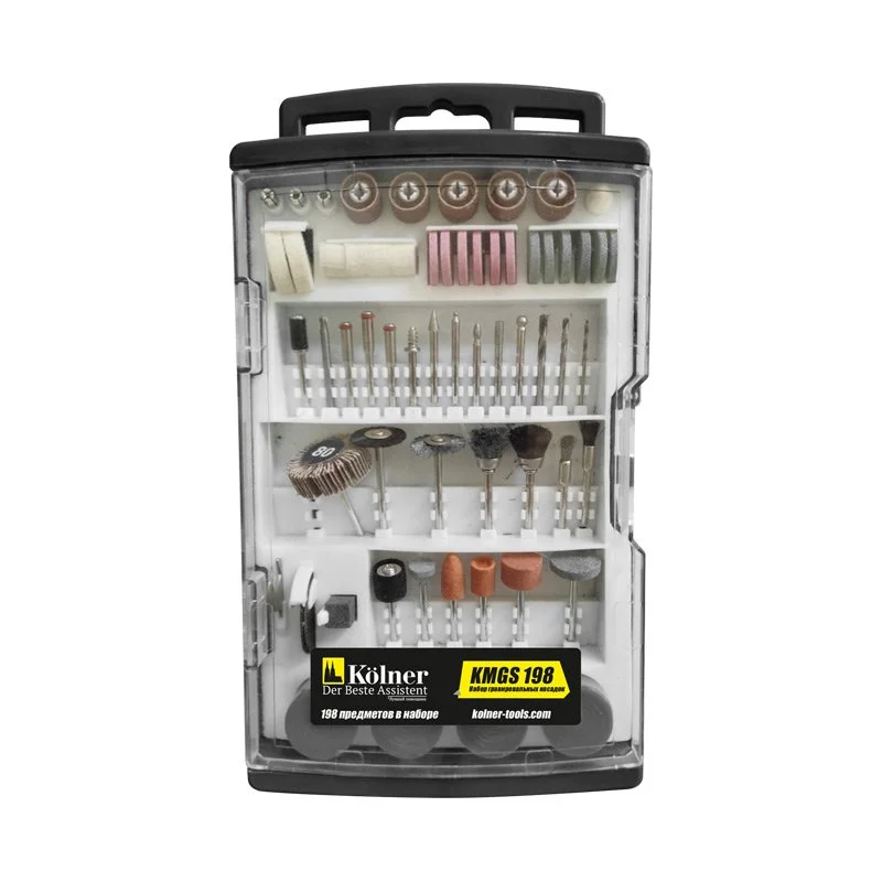 Лента шлифовальная 12.7х12.7 мм, Р80 - 5 шт. / Лента шлифовальная 12.7х6.35 мм, Р120 - 5 шт. / Вал с барабаном 12.7 мм - 1 шт. / Вал с барабаном 6.35 мм - 1 шт. / Войлочный круг 25.4х6.5 мм - 2 шт. / Войлочный круг 13х9 мм - 4 шт. / Войлочный конус 19х9.6 мм- 1 шт. / Шлифовальная насадка (хвостовик 3.17 мм) - 5 шт. / Цанга 3.2 / 2.35 / 1.6 мм - 3 шт. / Шлифовальный камень (хвостовик 3.17 мм) - 5 шт. / Насадка щетка (хвостовик 3.17 мм) - 6 шт. / Шлифовальный круг 22х3.2 мм - 12 шт. / Полировальный круг 20мм, Р220, Р240 - 105 шт. / Отрезной диск 24х0.06 мм - 29 шт. / Резак (хвостовик 3.17 мм) - 1 шт. / Сверло 1.6, 2.35, 3.2 мм - 3 шт. / Заточной камень 26х10 мм - 1 шт. / Вал для отрезных дисков (хвостовик 3.17 мм) - 3 шт. / Вал для войлочного круга (хвостовик 3.17 мм) - 1 шт. / Ключ гаечный - 1 шт. / Отрезной диск 32х1 мм - 2 шт. / Круг лепестковый 32х10 мм - 1 шт. / Паста - 1 шт. |
