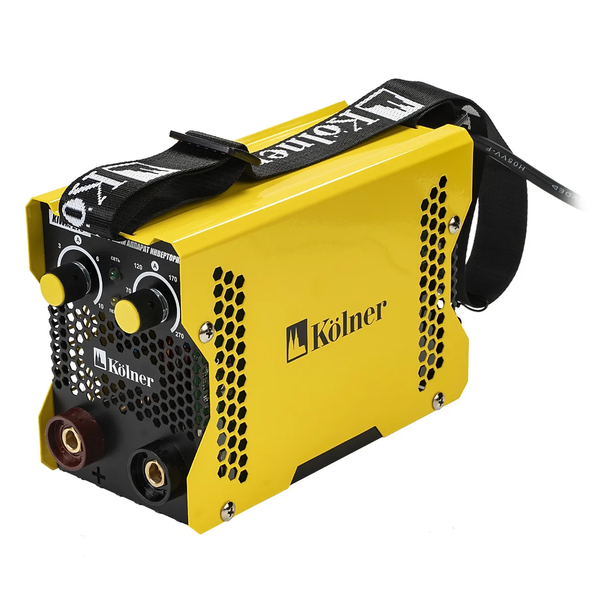 - КОМПЛЕКТАЦИЯ: рабочий кабель с электрододержателем, кабель заземления с клеммой, наплечный ремень.