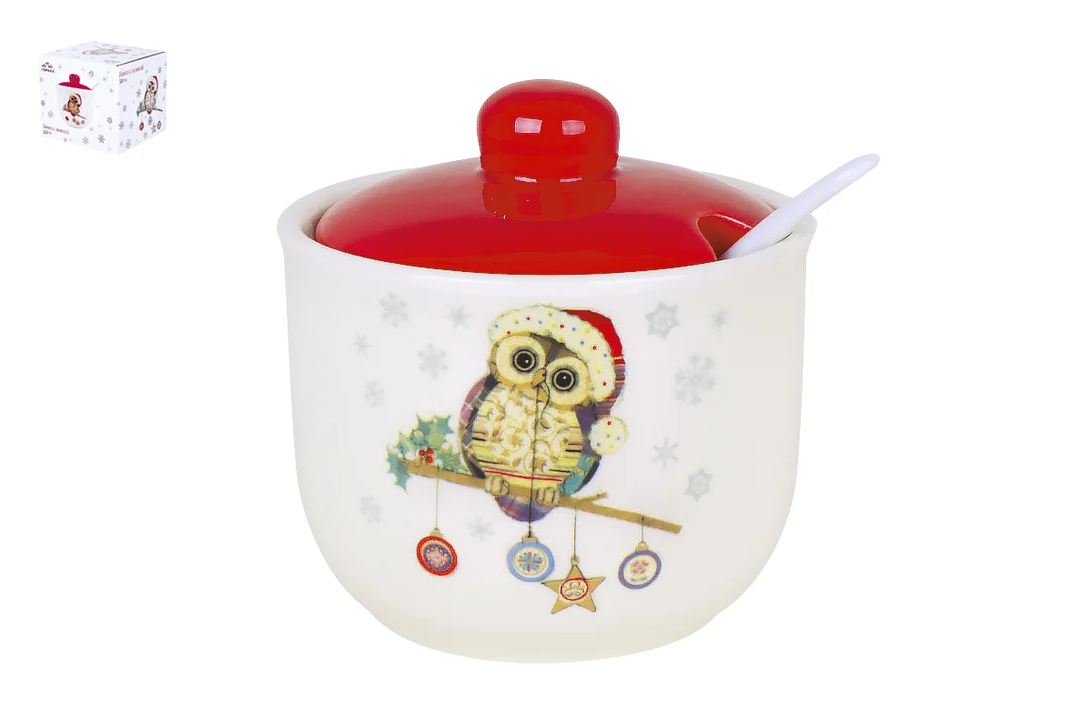 Керамическая банка с крышкой и ложкой предназначена для хранения сыпучих продуктов. Изделие декорировано новогодним дизайном и смотрится празднично и нарядно.