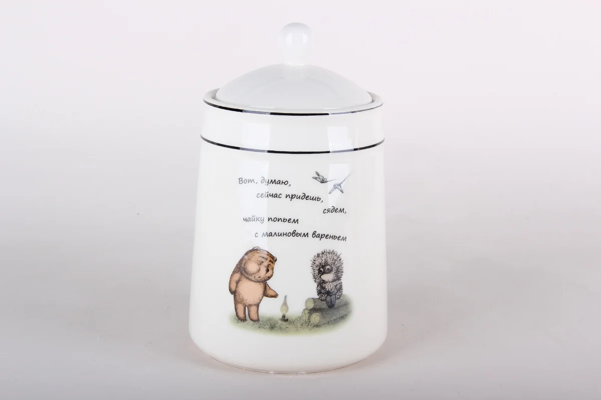 Любимые мульт-герои на вашей кухне поселят надолго хорошее настроение. Банка для сыпучих продуктов с крышкой выполнена из качественного белоснежного фарфора. Легкий дизайн позволит посуде вписаться в любой кухонный интерьер.