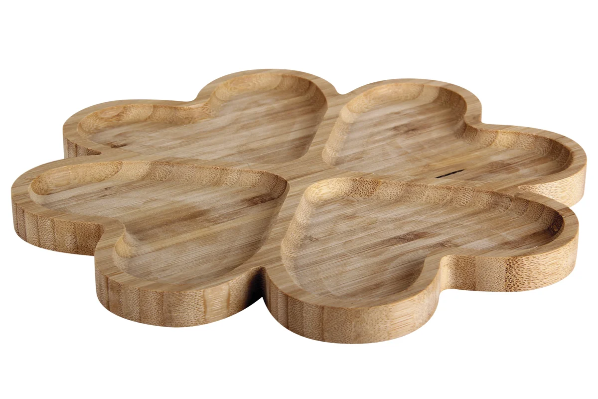 Блюдо изготовлено из бамбука и предназначено для сервировки продуктов. Фигурное изделие имеет 4 отделения.