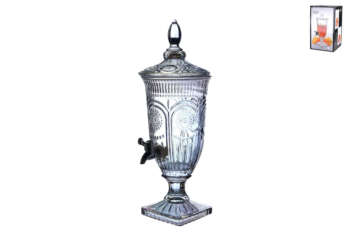 Эффектный диспенсер выполнен из толстого узорного стекла и устойчиво располагается на ровной поверхности. Изделие имеет удобную крышку и краник для комфортной подачи разнообразных напитков.