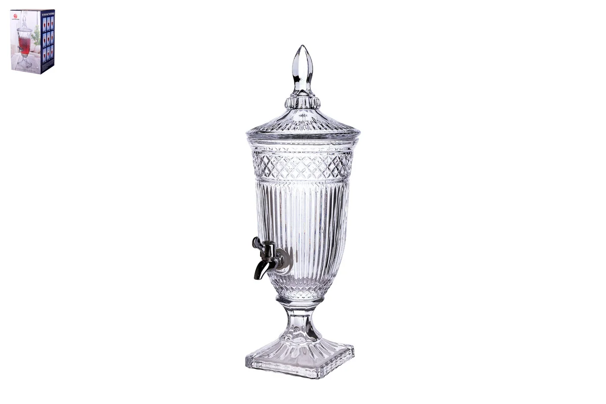 Эффектный диспенсер выполнен из толстого узорного стекла и устойчиво располагается на ровной поверхности. Изделие имеет удобную крышку и краник для комфортной подачи разнообразных напитков.