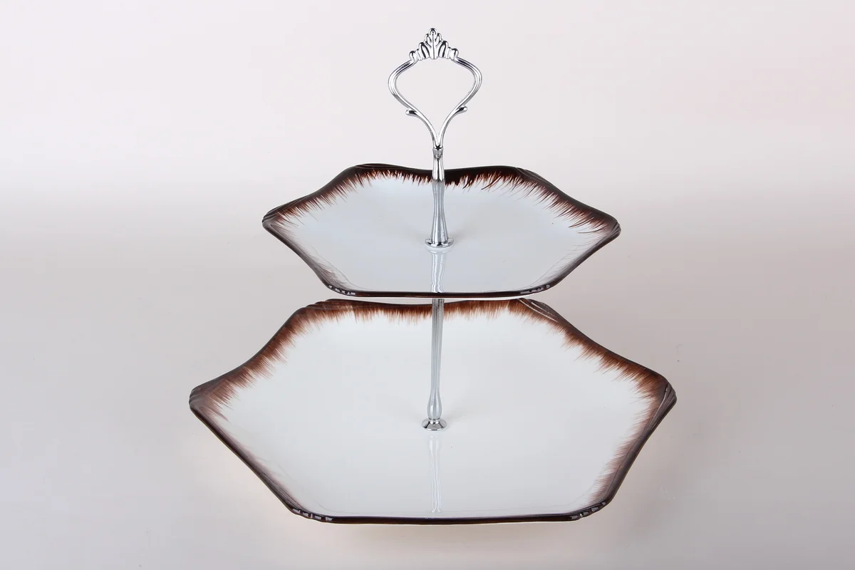 Двухъярусная ваза с параметрами 19,5х19х5*2см/28х28х3см (артикул 7116) выполнена из фарфора. Размер первого яруса — 28х28х3см, второго — 19,5х19х2см. Цвет — белый или коричневый, форма — фигурная.