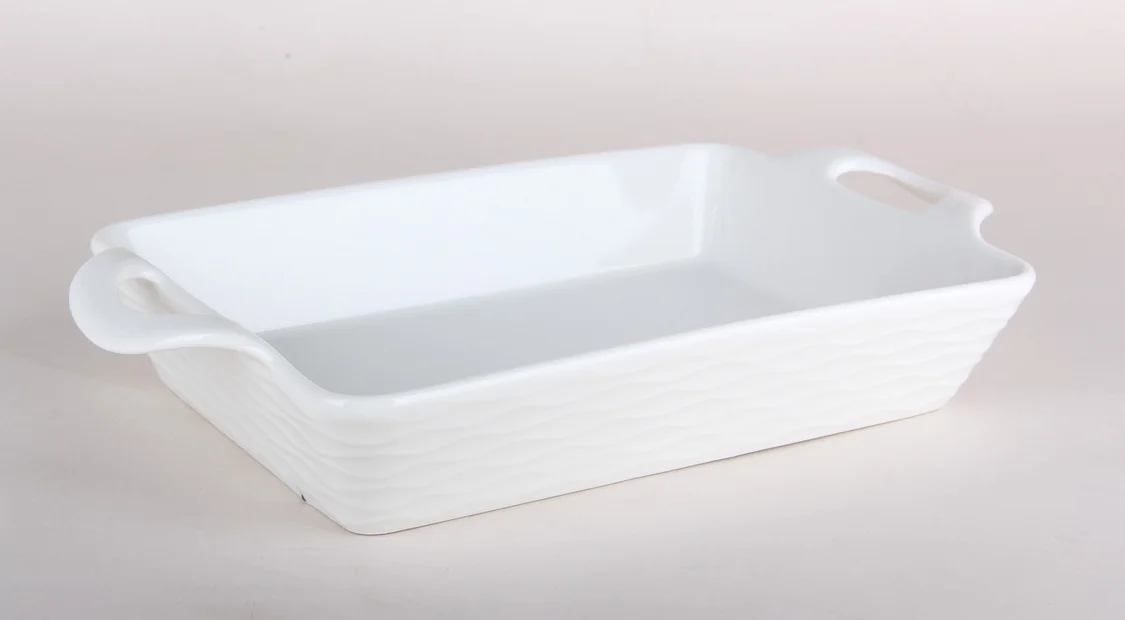Форма выполнена из высококачественного белоснежного фарфора и предназначена для выпечки в духовом шкафу. Изделие прямоугольной формы декорировано по корпусу выпуклым оригинальным узором и оснащено удобными ручками для переноски.