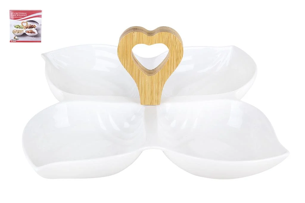 Фарфоровая менажница представляет собой настоящее произведение столовой посуды. Четыре фигурные секции, словно цветок обрамляют удобную ручку для переноски.