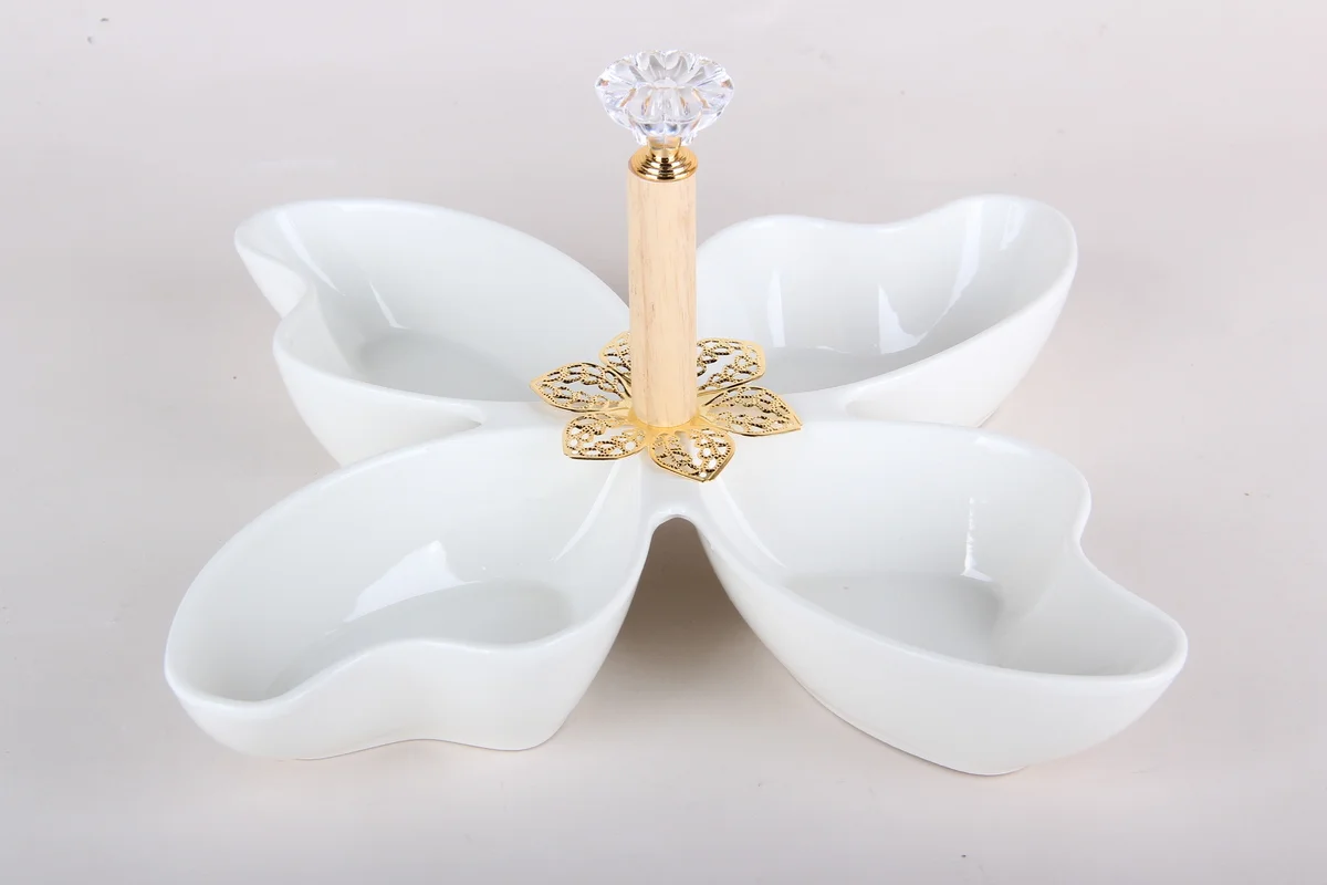 Фарфоровая менажница представляет собой настоящее произведение столовой посуды. Четыре фигурные секции, словно цветок обрамляют удобную ручку для переноски.