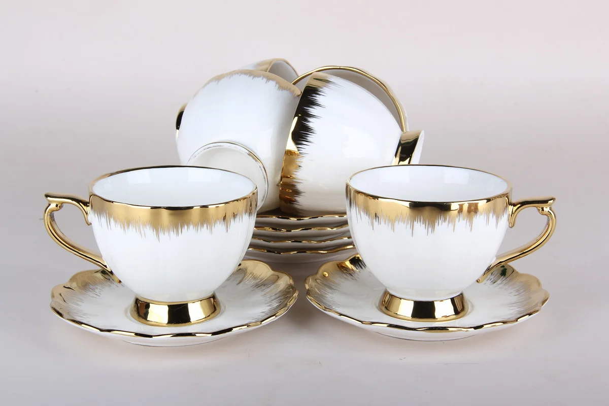 Чайный набор из фарфора рассчитан на 6 персон. Белоснежные предметы декорированы золотым узором.