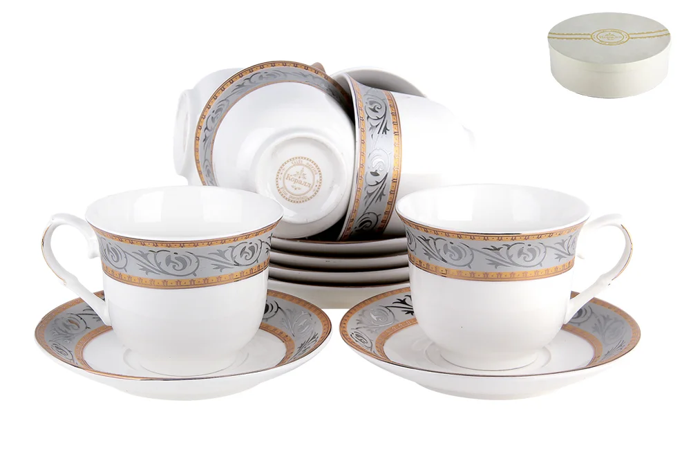 Чайный набор изготовлен из фарфора и рассчитан на 6 персон. Комплект украшен оригинальным орнаментом по краю, что делает его стильным и лаконичным.