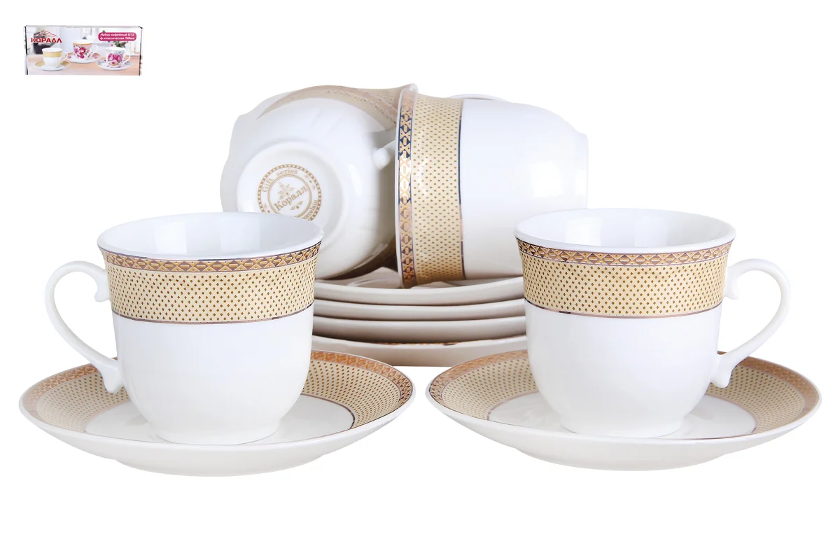 Кофейный набор изготовлен из высококачественного фарфора повышенной белизны и рассчитан на 6 персон. Чашки с блюдцами декорированы по краю золотым орнаментом. Такой дизайн делает комплект стильным и изящным.