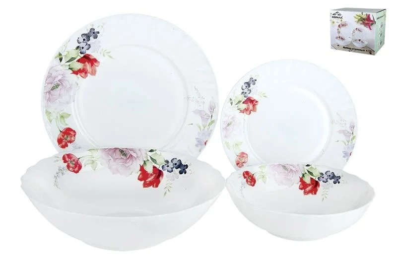 Столовый набор из стеклокерамики, этот материал отличается прочностью, по сравнению с обычным стеклом, а также экологичностью. Посуда из стеклокерамики прослужит Вам очень долго. Также ее можно использовать в микроволновой печи, так как она не боится больших перепадов температуры.