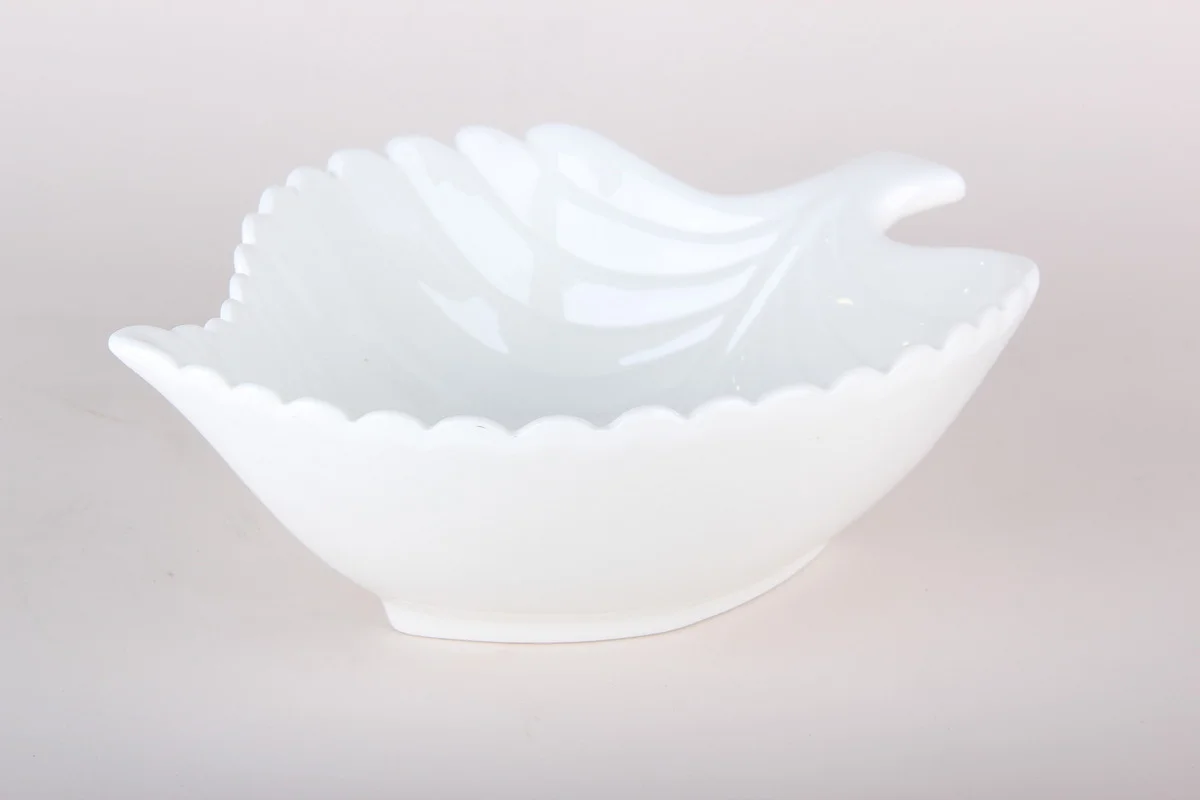 Салатник в форме листа изготовлен из белого фарфора. Благодаря интересному дизайну, изделие станет украшением любого застолья.