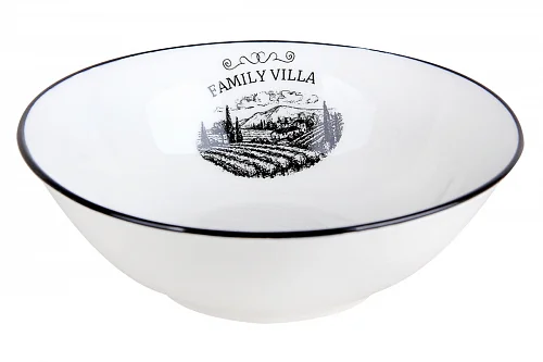 Круглый салатник изготовлен из доломитовой керамики и покрыт белоснежной глянцевой глазурью. Посуда декорирована приятным сельским пейзажем. Эксклюзивная разработка и облегченный вес делают изделие уникальным.