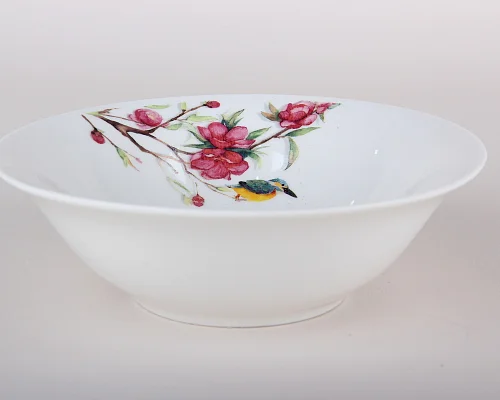 Салатник выполнен из фарфора и декорирован цветочным узором. Удобная посуда подойдет для подачи разнообразных салатов.