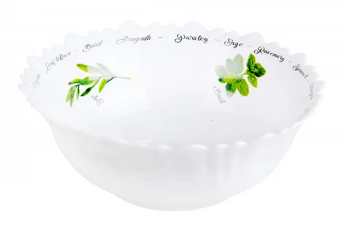 Салатник изготовлен из высококачественной стеклокерамики и имеет волнистый край. Изделие украшено каллиграфическими надписями и растительными рисунками.