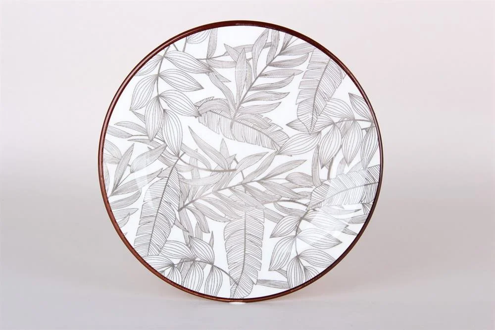 Изготовлена из твёрдого фарфора, который устойчив к сколам. Внешний вид тарелки украшает белый фон с чёрно-белой композицией листьев.