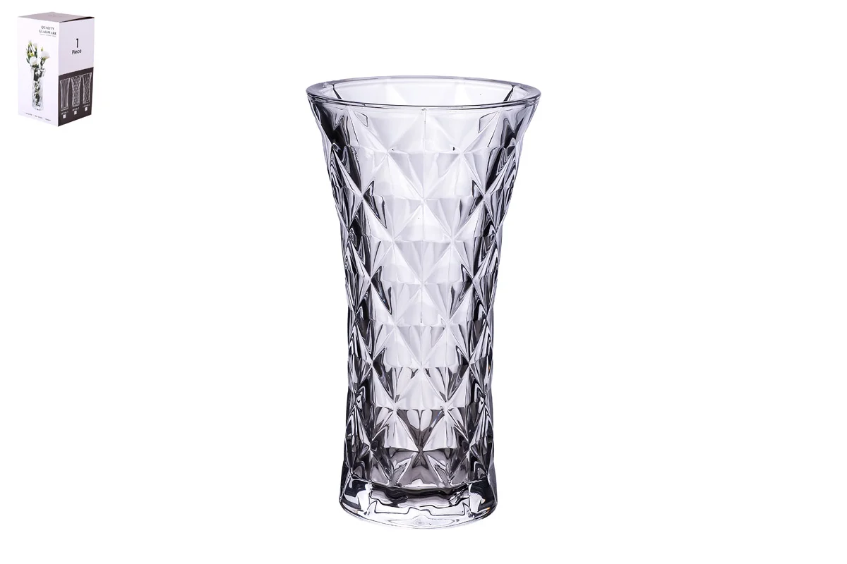 Ваза из прозрачного толстого узорного стекла станет самостоятельным украшением любого интерьера. Изделие великолепно переливается на солнце и излучает приятный блеск.