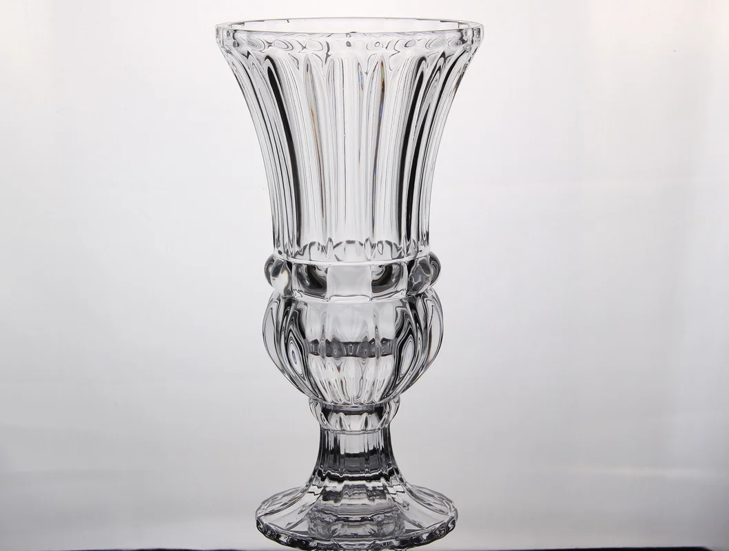 Стеклянная ваза на ножке устойчиво располагается на ровной поверхности. Такой материал легко мыть, идеально подходит для размещения живых цветов.