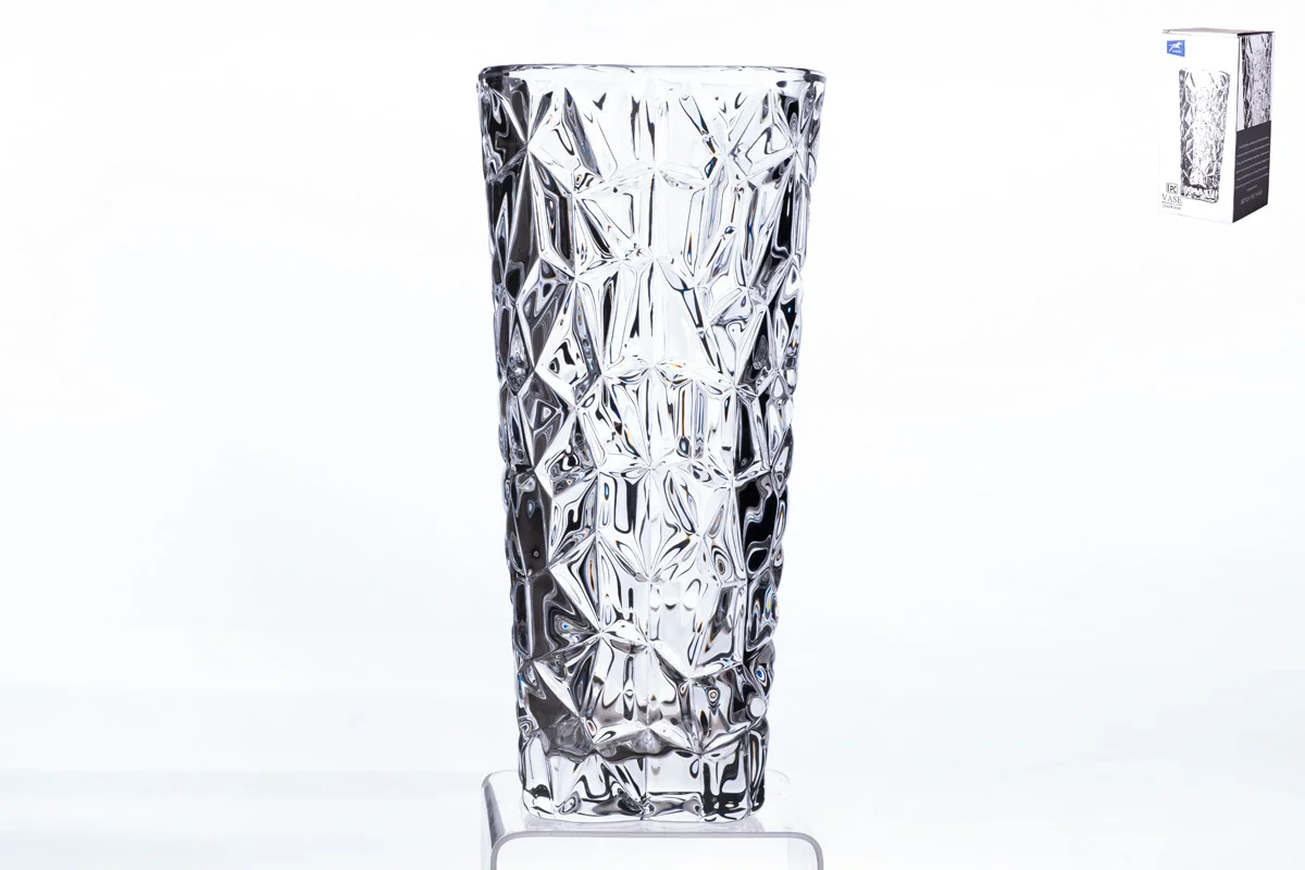 Элегантная вазастанет настоящим украшением любого интерьера. Изделие выполнено из толстого узорного стекла.