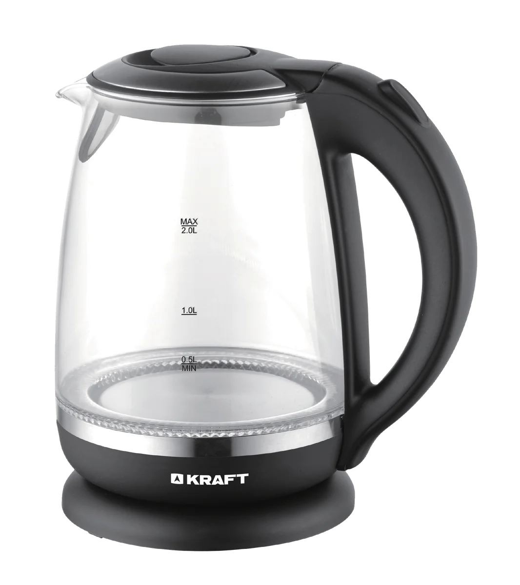 Электрический чайник KRAFT KF-KG2018BL в черном цвете с металлическими вставками мощностью 2200 Вт. Прибор способен за несколько минут довести до кипения 2 л воды. Корпус чайника выполнен из боросиликатного стекла и пластика, в носике прибора расположен нейлоновый фильтр. Чайник имеет контроллер LIANGJI, рассчитанный на 10 000 рабочих циклов.